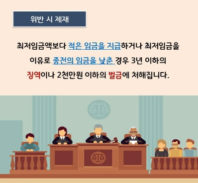 이를 위반하여 최저임금을 이유로 종전의 임금을 낮춘 자는 3년 이하의 징역 또는 2,000만 원 이하의 벌금에 처해집니다.